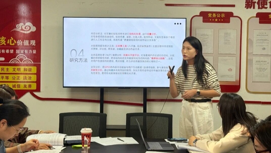 本次评审会以 “严谨公正、提质赋能” 为原则,既聚焦优质项目筛选,更注重对申报教师的专业指导 —— 通过精准把脉项目方案,助力教师完善研究思路,为后续冲击省级、国家级科研项目筑牢基础。会上,四位申报教师按既定顺序依次汇报项目,围绕研究背景、核心意义、目标设定、内容框架、方法路径、创新亮点、预期成果及可行性分析等维度系统阐述,充分展现了在相关领域的深度思考与实践探索:有的选题聚焦新媒体时代传播业态变革,试图破解行业发展痛点、挖掘传播新规律;有的则锚定地方文化传播需求,计划通过纪录片、短视频等传媒手段,为地方文化传承与活化注入新动能。